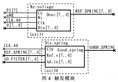 单片机先向FPGA模块写入设置的触发电压,FPGA内部相比较后,当采样值大于该触发电压时,则产生一次触发。图4为触发模块。