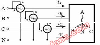 图1 三表法测三相四线制三相负载平均功率的接线示意图