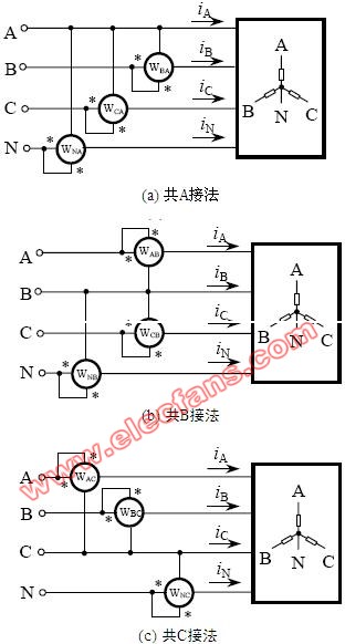 上述四种三表法的接线的特点是每组接线中的三个表所接电压均以同一根线为参考点,即分别是共A, B, C 或N,而电流则分别是非参考线中的电流。功率表接线的极性端如图中所示。