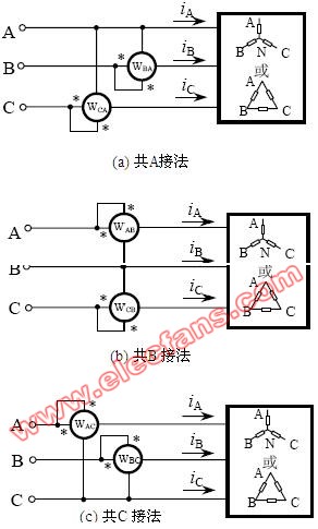 对于三相三线制系统(Y 接或Δ接),由于没有中线,故图1 所示的接法便不存在,图2中接在中线上的功率表也不存在。此时的接线方法将只有图3 所示的共A, 共B 和共C 三种接线方式。可见,此时功率的测量只能用两表法测量,每组接线中单个功率表的读数没有物理意义,两个表读数的代数和表示三相负载吸收的总平均功率。