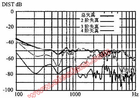在实际的音频测量时,通常在一定的频率范围内选取若干个频率点,分别测量出各点的谐波失真,然后将各谐波失真数值以频率为横坐标连成一条曲线,称为谐波失真曲线。如图2是某功率放大器在100-1OKHz范围内的总谐波失真和2阶、3阶及4阶谐波失真的曲线图。