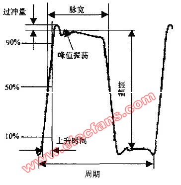 方波分析具有良好的突变性及周期性,通过观察设备对方波信号的输出信号波形能够很好的检测设备的各项性能,因此方波信号成为最常用的时域分析信号。图1是音频设备对方波的响应信号在半个周期(上升沿)内的具体描述。描述方波响应有上升时间、峰值振荡、过冲量及倾斜度等几个最主要参数。