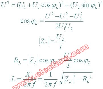 将电感线圈与一个可变电阻器串联,其测量电路如图5.7.2所示。选取适当的电阻值,测出电压U、U1、U2,以及电流 I 的值。根据电路中各电压间的相量关系如图5.1.3所示,可求得: