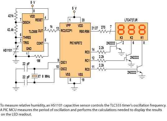 MCU测量输入信号周期,并将其转换为相对湿度数字读数。这通过MCU内部计数器(TMR1)和捕获/比较/脉宽调制模块(CCP)来实现的。