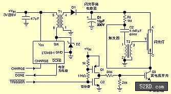 闪光电容器充电器基本上是一种具有某些特殊能力的变压器耦合升压转换器。当其 “充电” 控制线为高电位时,稳压器同步内部功率开关,使升压变压器产生高电压脉冲。然后,这些脉冲再经整流和滤波,产生300V的直流输出,其转换效率高达80%。