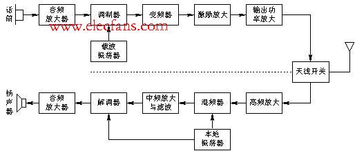 低频音频信号经放大后,首先进行调制后变成一个高频已调波,然后可通过变频,达到所需的发射频率,经高频功率放大后,由天线发射出去。接收设备由接收天线、高频小信号放大器、混频器、中频放大器、解调器、音频放大器、扬声器等组成。由天线接收来的信号,经放大后,再经过混频器,变成一中频已调波,然后检波,恢复出原来的信息,经低频功放放大后,驱动扬声器。