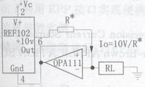 REF102是10V精密电压参考源,精度为±0.0025V,温漂为2.5ppm/℃max,可满足本系统电阻测量的要求。OPA111精密运算放大器作为电压跟随器,使得REF102的GND端和放大器的同相端相等,即R*为高精度、低温漂的精密电阻,则流过RL的电流为精密恒定电流。整个电路等效为恒流源电路。