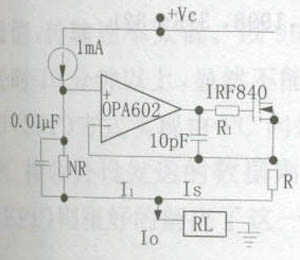 选择NR、R为高精度低温漂电阻,OPA602为精密运算放大器,则扩展后输出的电流是精密恒流源。