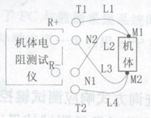 测试原理是四线测试法。选择L1~L4四根导线为相同导线电阻的镀银导线。M1、M2为机上测试连接点。在同一个测试点上拧紧两根测试线,L1和L2,L3和L4。导线的另一端接至测试接线盒的接触电阻小于0.05毫欧的φ6镀金接线柱。采用手动连接活动镀金接线片的办法,构成三种测试状态:R+接T1、R―接N1,测量出L1、L2及接触点M1的接触电阻;R+接N2、R―接T2,测量出L3、L4及接触点M2的接触电阻。将这两个电阻值取平均值作为测试线路的系统误差。最后测出R+接N2、R―接N1的电阻值,减去上述测得的测试线路系统误差,即得到机体电阻值。