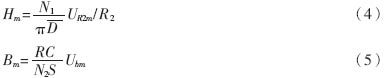 本文中激励信号为正弦波,若磁心线圈是线性元件,则根据欧姆定律可知,通过磁心线圈的激励电流也是正弦的。但是,实际的磁心线圈是非线性元件,所以磁化电流和电压必为畸变的波形。较多的初次级线圈匝数也会使回线变形,原因是线圈多了,匝间分布的电容加大,通过分布电容的位移电流加大,当然会使回线变形。另外,H路信号的电压是从取样电阻上获得的,为了保证B为正弦波,取样电阻阻值要低,且有很大的功率,并要求它是无感的。实际的电阻不是理想的,其分布电容和电感使H信号随着频率的升高而失真。本文采用的是10W的线绕电阻,若采用