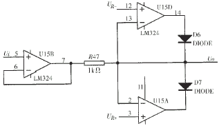 在模/数转换中,如果A/D转换器损坏,检测和控制的功能就不能实现。出于安全考虑,在A/D转换器前采用限幅电路,以保障系统的A/D转换器安全。传统的限幅器如齐纳二极管限幅器、稳压管反向限幅器、桥式限幅器等,都是利用二极管的击穿特性限幅。在击穿区由于二极管内阻并不为零,并有漏电流存在,所以稳压值并非恒定而且不易调节。本系统所设计的限幅电路如图2所示,设定UR=±2.5V,由TL431提供高精度的基准电平。