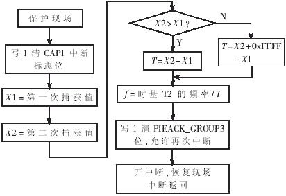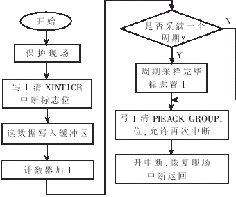 本采样系统的软件结构较为复杂,涉及的算法也较多,为了便于调试和维护,软件设计遵循模块化、自顶向下、逐步细化的编程思想。软件采用C语言和汇编语言混合编程,主要软件可划分为主程序、采样中断服务子程序、频率捕获中断服务子程序三大模块。图5所示是主程序流程图,软件的工作过程是:系统上电复位后,首先按照所选定的模式(调试时为Jump to H0 SRAM模式,实际应用时为Jump to Flash模式)自举加载程序,跳转到主程序入口;然后进行相关变量、数据缓冲区、控制寄存器、状态寄存器的初始化;调用事件管理器EV初始化程序,设定PWM1的周期(5MHz)、占空比,捕获单元CAP1时基T2的输入时钟分频数、周期,并启动T1、T2;初始化外设扩展中断PIE,使能所用到的外部中断XINT1和捕获中断,清中断标志位,开全局中断;而后复位并初始化外部的ADS8364,等待外部中断,在中断服务子程序中将A/D转换后所得数据读入所分配的数据缓冲区,待周波采样完毕后,根据原通道采样物理量(交流、直流)调用不同的数字滤波程序,对数据处理后,调用各计算子程序,计算所需的有效值、有功功率、无功功率、功率因数、平均值。采样中断子程序和频率捕获中断服务子程序的流程图如图6所示,其中频率捕获中断的时基精度为0.43μs。TMS320F2812为定点DSP,为了提高运算的精度和速度,软件设计中充分利用TI 公司提供的IQmath Library 以实现浮点运算与定点程序代码的无缝接口,简化了程序的开发,并大大提高了程序运行的实时性[6]。