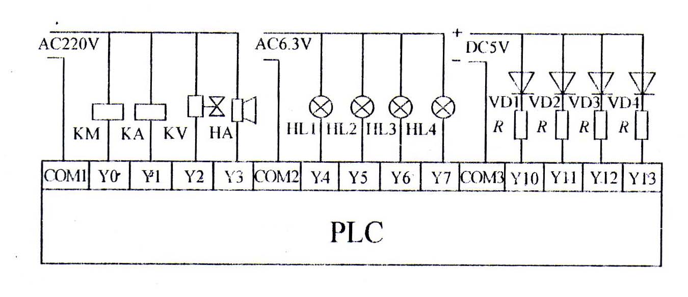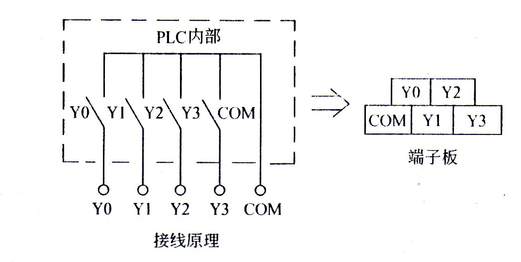 输出点的共COM问题:一般每个输出点应有两个端子,为了减少输出端子的个数,PLC在内部将其中的一个输出点采用公共端连接,即将几个输出点的一端连接到一起,形成公共端COM,如下图1-3所示。