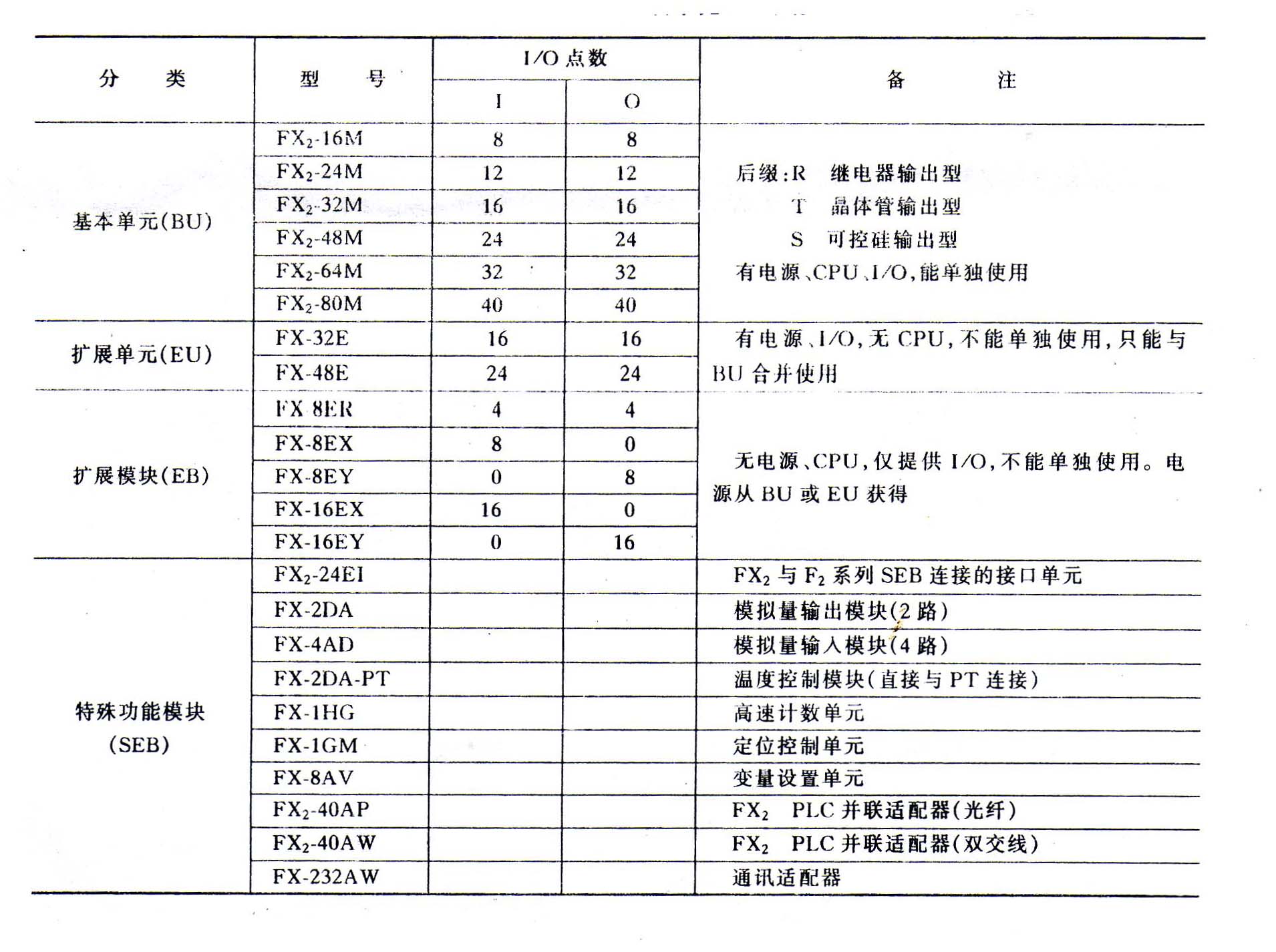 表1-1 常用FX2系列PLC型号