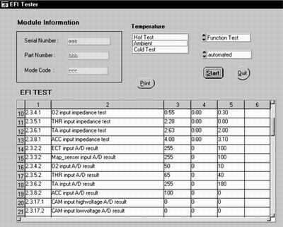 编者按:本文介绍了通过使用美国NI公司的LABWINDOWS软件和相应的硬件设施(NI-5112、PXI-8156B、NI-5411、PXI-6070E、NI-2503),完成对汽车电喷模块(EFI)输入/输出口的硬件测试及将测试数据生成TXT文件存盘的方法。同时通过编程完成了对设定工况下模块的功能测试,从而确保了产品的可靠性。