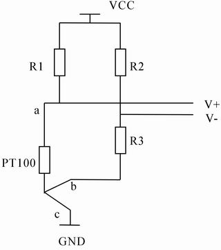系统采集的模拟量主要是温度信号。系统采用PT100铂电阻作为采集温度的传感器。对于铂热电阻由于其阻值较小,因此采用三线制测量电路,从而消除引线电阻的影响。热电阻的输入电路如图2所示,由R1、R2、R3和被测电阻组成普通四臂电桥。