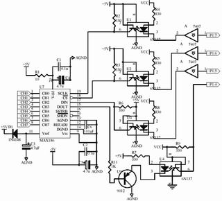 系统用单片机的普通I/O口模拟MAX186所要求的串行通讯时序,照此方法同样可以实现它们之间的连接,从而使该器件得到更广泛的应用。图3是用单片机的通用I/O端口与MAX186进行串行通讯的A/D转换应用电路。模拟信号分别通过MAX494运算放大器缓冲后进入MAX186的输入端CH0~CH7。MAX186的串行接口与单片机的I/O口之间通过高速光耦6N137相连,从而使模/数信号隔离开来。I/O的REFADJ接AGND,即采用内部基准电压源作为A/D转换的基准。VREF与地之间接4.7mF电容,SHDN悬空,即采用参考/缓冲放大器的外部校正模式。而通道的选择、通道的工作模式以及关断模式等由软件设定,采用内部时钟模式工作。