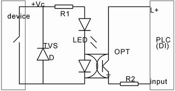 开关量的光电隔离接口电路采用普通的光耦元件实现,如图2所示。其中LED用于指示设备的工作状态,TVS为瞬变电压抑制器,选用了单向TVS二极管P6KE30A,其阻断电压为28.5V,工作电压为25.6V,脉冲峰值电流14.7A,典型的响应时间小于1ps。当其雪崩击穿时,动态电阻小,响应速度快(理论上高达10-12s),器件面积大,可吸收大的浪涌电流。现场使用的结果表明:将该器件放在接口电路板的输入/输出端附近,能有效地减小高压打火对集成电路芯片的损坏。如果再配以适当的RC电路,其效果会更明显,且还具有一定的滤波作用。