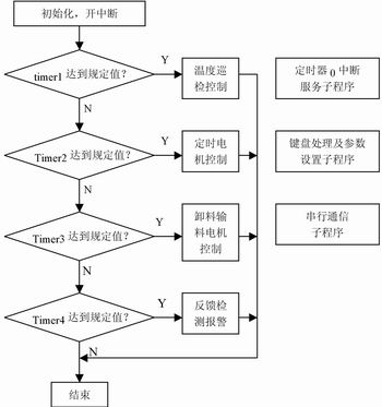 本系统分温度巡检控制、定时电机控制、卸料输料电机控制、电机反馈检测报警、键盘参数设置和串行通信六个功能模块。其中键盘参数设置和串行通信采用中断方式,其余的功能模块都由定时器0来控制。