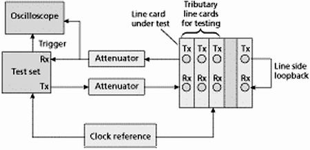 在对线卡的接收器电路进行测试之前,必须对要测试的设备进行同步化,同步时钟可以来自测试装置也可以来自外部信号源。通过改变测试信号的频率,可以测试PLL电路对静态偏移的跟踪能力,在偏移量超过时钟恢复电路的锁定范围时,数据流中就会掺入误码。