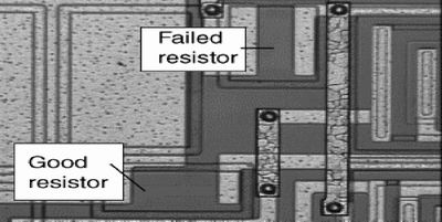 最低电阻击穿路径存在于负输入和负电源线之间,于是EOS电流便流经了这条线路。而由于除该电阻器以外我们没看到金属线或其它元件受损,因此得到结论,这一EOS事件只产生了少量的能量。还有,如果是慢脉冲理应损坏NiCr电阻器的中心而非损坏全部电阻区域。因此,我们认定EOS事件的出现十分迅捷,有一个快速上升时间。