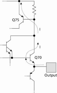 基于我们的观察以及运算放大器的应用,认为发生损坏是因为对运算放大器的输出脚施加了正电压。OP1的局部示意图(图4)显示出电流从运算放大器的输出脚流经Q70及Q75到达V+线路的路径。Q70是一个大的输出晶体管,可以应付EOS事件的功率,但Q75不能,正如我们在Q75的基极-发射结处发现铝“短路”所反映的一样。这种小的晶体管在不短路的情况下是不能消掉EOS事件的大量能量的。在电流达到临界电平后,通向焊盘(bond pad)一端的金属输出线路烧断,如图2所示一大段线路烧坏。烧掉如此大段的金属线需要短时间内的大电流脉冲(1~2A)。