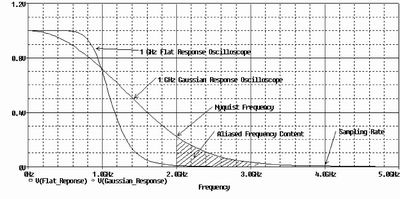 对于图1中采样率为4GHz的例子,NyQuist频率为2GHz。高斯响应示波器允许采样2GHz以上的频率成份,这些频率成份会对信号造成采样混叠误差。但平坦响应示波器衰减了2GHz以上的所有频率成份,因此不存在采样混叠误差。