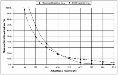 若被测信号上升时间减小特别快(即更快的跳变沿),高斯响应示波器反而会超过平坦响应示波器的上升时间测量精度。这是因为随着信号上升时间减小(即跳变沿更快), 信号-3dB 以上频率成分不断增加,此时平坦响应示波器的幅度响应将低于高斯响应示波器。