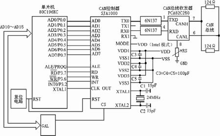 SJA1000在电路中是一个总线接口芯片,实现从上位机PC-CAN接口到现场微处理器之间的数据通信。对于微处理器而言,SJA1000是一个总线接口,SJA1000片内的存储单元相对80C196KC来说是片外的数据存储器,因此,可以按照扩展片外数据存储器的形式来访问SJA1000的寄存器地址。80C196KC是CAN控制器的微处理器,把80C196KC的ALE、RD、WR和 SJA1000的ALE、RD、WR相连就构成一个最小系统节点。80C196KC通过地址总线经GAL译码来选通 SJA1000,并由此决定CAN控制器各寄存器的地址,通过读、写外部数据存储器的形式来访问 SJA1000。在系统中我们将SJA1000的TX1脚悬空,RX1引脚接地,形成CAN协议所要求的电平逻辑。该电路的主要功能就是通过CAN总线接收来自上位机的数据进行分析组态,然后下传给下位机的控制电路实现控制功能,当智能控制系统接收到下位机的上传数据,SJA1000的中断输出INT脚就会被激活,出现一个由高电平到低电平的跃变,产生一个中断,从而引发微处理器80C196KC产生中断,通过中断处理程序接收每一帧信息并通过CAN总线上传给上位机进行分析,以便及时纠正误码、错码。