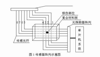 复合材料正得到越来越广泛的应用,但其结构内部损伤很难用常规方法检测到。现有的各种无损探伤方法,如X射线及超声C扫描等,使用既不经济又不能实行实时在线监控,有时还会造成误诊断。利用光纤作为传感器的优良特性,将光纤网络(分布式光纤传感器)埋入复合材料结构内部,材料内部结构状态(如应力、应变等)的改变会导致光纤内通过的光能量发生相应的变化,即材料内部状态量与光纤内通过的光能量有一一对应的函数关系,这样通过检测光纤内通过的光强信号的强弱变化,就可以探知材料内部结构损伤的程度,通过合理的布置光纤网络并对网络中的各根光纤进行具体编号,可以获得材料结构内部各点(光纤网络节点)所受的应变值,即可实现故障定位。光纤传感网络的结构及布置原理如图1。