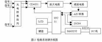 光纤中通过的光信号,经光电传感器(光探测器)转换成电信号,这是个模拟量,需经A/D转换成数字信号,经单片机处理后送入PC机,计算机完成对信号的处理,并显示复合材料内部结构的网络图并显示对应各网络节点的损伤程度。因此,系统应包括两部分:前端是一个单片机数据采集系统,完成对多路光信号的采集,并把数据送往计算机;后端有计算机完成对数据的处理、图像模拟。两者通过RS232串行通信传输数据,不通信时,两者可以各自独立工作,单片机不占用计算机资源。