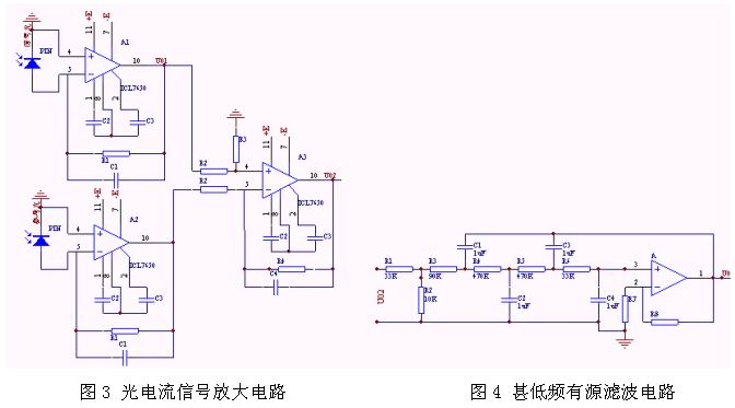 由于复合材料所受的应变引起光纤传感器光强信号的变化很小,经光探测器转换后的光电流信号变化极其微弱,加上各种噪声的影响,因此,要准确检测光电流信号必须采取特殊的措施,本系统的信号调理电路包括两部分:放大电路及滤波电路.