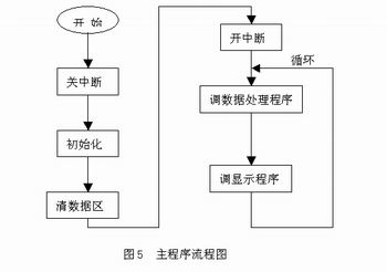 检测系统的软件设计主要完成数据的采集、存储、滤波、变换和发送,与计算机接收程序的协调。按功能分,可以把检测程序分为:(1)初始化程序段,用来设定89C51单片机内部一些寄存器的初始值以及串行口和定时器的工作状态;(2)数据采集程序段(由A/D转换结束信号触发89C51的外部中断/INT0引发的中断服务程序),完成各通道信号的采集并存放在系统数据存储器中的工作;(3)数据处理程序段,完成对各通道采集的数据进行数字滤波、变换,把变换后的值送往指定的数据存储单元;(4)显示程序段,依次把通道号及各通道对应的数据送往LCD显示;(5)通信程序(串行中断服务程序),程序的功能是将各通道采集到的数据发送给计算机。要发送数据,首先必须与PC机建立握手信号,然后才可以发送数据,为确保接收到的数据的正确性,单片机在发数据的过程中,每发送一个数据,就等待计算机发回应答信号,如应答信号不正确(不是规定的应答信号),则重发上一次数据,发完8路信号时,即完成一次完整的数据通信。主程序流程图如图5,数据采集及通信在各自的中断服务程序内完成。以上为单片机系统的程序设计,采用MCS—51汇编语言编制,固化在89C51片内4K的EEPROM内。计算机的接收程序采用C语言编制,可以充分利用C语言表达能力强、使用灵活、支持结构化程序设计又可以方便进行内存及I/O等底层硬件操作等优点。