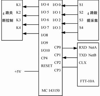 Neuron芯片我们选用MC143150,LonWorks收发器选用FTT-10A,LonWorks通信介质选用双绞线。利用MC143150的通讯口(CP0——CP4)和FTT-10A相连完成与LonWorks网络的通信,利用MC143150的I/O口(I/O0——I/O10)与远传表和关断开关相连,完成数据采集和关断控制。图3为节点的硬件接口框图。