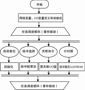 两个EEPROM存储类型的数据:一个是用于存储电脉冲累计值的unsigned 数组sum,另一个是用于保存关断状态的整数变量state。将它们放入EEPROM存储器中,而不是放入RAM中,这样当节点掉电时,其值不会丢失。