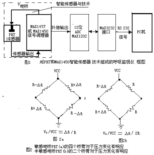 1.1、 呼吸医疗监视仪 用来监视呼吸状况,并能给出大致的呼吸深度。这个监测仪监测一些可以用来评价焦虑程度的重要参数:呼吸频率、呼吸的均匀程度以及呼气和吸气之间的间歇。平静、积极的情绪通常会导致呼出长于吸入,二者的时间之比从一个方面揭示人的焦虑程度。相对较高水平的胸呼吸(相对于腹呼吸)也可说明焦虑程度。对于胸呼吸的观察可增加监视仪的可视信息。 1.2、 智能传感器技术 图1中的监视仪采用硅压阻式传感器(PRT)检测吸入与呼出时对应压力的降低和增加。PRT的输出被馈入一个MAX1450信号调理IC,用于对PRT的固有误差进行校正,然后将经过补偿的电压信号送入12位模数转换器ADC。ADC输出(数字化的压力信号)接着进入一个PC接口,并被转换为RS-232电平。最后信号被传递到PC,这样就可以显示出呼吸波形,并对以上所述参数进行分析。 2、PRT传感器 2.1、PRT检测原理 PRT一般配置为一个紧密的惠斯登电桥。当有压力施加到PRT的敏感电桥时(见图2a所示),对角桥臂的电阻值将发生相同方向、相同大小的改变。当一个对角桥臂上的两个电阻值在压力的作用下增加时,另外一个对角桥臂的电阻值降低,反之亦然。对于半敏感电桥PRT(见图2b所示),则只有半边桥臂的电阻值发生改革。不管是全桥还是半敏感电桥的PRT传感器都具有高灵敏度(>10mv/v)、良好的线性和温度稳定性、无信号滞回等优点,其测量范围可上至破坏性极限。