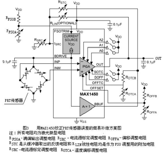 2.2、PRT的应用 当今,由于新的IC技术已经能够精确校准传PRT感器,所以将其应用范围从中、低精度检测扩展到高端领域之中。解决了以往PRT传感器通常只能用在中、低精度检测在高端产品非要采用昂贵的应变计等不足之处. 3、信号调理IC与现代和与简化校正方案 由于PRT传感器的误差幅度范围很宽,因而必须要用通过现现代与简化补偿法来校准。目前最新型的用来校准PRT传感器误差的信号调理IC有两种,一是MAX1457,二是MAX1450。 3.1、现代和校正方案 MAX1457它带有一个用于驱动传感器的受控电流源和一个采样传感器桥路电压的ADC,这个电压是电流输出电流和与温度相关的桥路电阻的乘积。MAX1457内含EEPROM等.通过为MAX1457设计的应用软件计算出四种校正系数:满偏输出(FSO),温度(FSOTC),偏移(Offset), 温度偏移(OffsetTC). 来修正误差. 由于MAX1457所提供的精度可远高于一个呼吸监视仪的要求,即没有必要采用16位分辨率的DAC进行校正, 但MAX1457它的温度误差补偿能力对于不大的温度变化也是很有必要的:10℃的变通常会造成PRT的满偏输出(FSO)发生3%的改变,真因MAX1457使监视仪可以工作在很宽的温度范围,应用PRT和MAX1457组合可获得优于的精度故它能应用于空间探测及潜水呼吸器等领域。 3.2、简化校正方案 MAX1450信号调理器(见图3所示)的功能本质与MAX1457相同,只是用电阻代替DAC来进行误差校正。因MAX1450采用MAX1457比少得多的校准点,其精度为1%。通常被用于混合方案,该方案将MAX1450和缴光微调电阻(所有外接电阻)相结合提供了一种低成本的解决方案, 即用MAX1450信号调理器配合外部激光微调电阻可提供1%精度。调整RFSOA电阻是设定初始(FSO)灵敏度,温度偏差的调整是通过反馈传感器驱动电后电压(来自BDRIVE引脚)来实现,由PGA程控放大器来完成偏差的补偿。 值此对MAX1450引脚功能作一介绍: