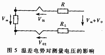 当电流回路的导线采用不同的金属,并且在连接处具有不同的温度时,则在回路内将产生温差电势。在图5中,如一支路R为康铜,另一支路RL为铜,则温差电势V0=V01-V02=1~100μV,此电势将叠加到测量电压Vm上,使得终结果为Vm+V0。