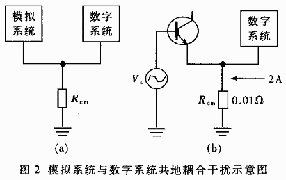 测试系统往往共用一个直流电源或不同电源共用一个地线。因此,当各部分电路的电流均流过公共地线时,会在其上产生电压降,形成相互影响的噪声干扰信号。这种情况在数字电路和模拟电路共地时非常明显。图2(a)中Rcm是模拟系统和数字系统的公共接地线的电阻。通常,数字系统的入地电流比模拟系统大得多,并且有较大的波动噪音。即使Rcm很小,数字电路也会在其两端形成较高电压,使模拟系统的接地电压不能为零。图2(b)中模拟电路是测量前置放大器,数字系统的入地电流(若为2A)在Rcm(若为0.01Ω)上产生电压(20mV),此电压与测量电压Vs叠加。若Vs=100mV,那么测量精度将会低于20%。