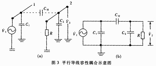 对于平行导线,由于分布电容较大,容性耦合较严重。在图3(a)中,导线1和导线2是两条平行线,C1和C2分别是各线对地的分布电容,C12是两线间分布的耦合电容,V1是导线1对地电压,R是导线2对地电阻。由图3(b)等效电路可得导线1电压通过耦合导线2上产生的电压V2为:
