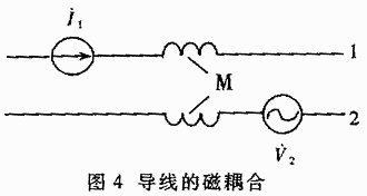 此电流所产生的磁场通过互感耦合对邻近信号形成干扰。图4是互感耦合示意图,两邻近导互之间存在分布互感M,M=φ/I1(其中,I1是流过导线1的电流,φ是电流I1产生的与导线2交线的磁通),由互感耦合在导线2上形成的互感电压为V2=2ωMI1,此电压在导线上是串联的。从式中可知V2与干扰的频率和互感量成正比。