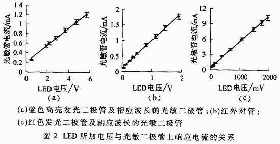 实验证明,光敏二极管的反向电流在一定范围内与LED上的加载电压存在正比的函数关系,如图2所示。这是因为LED正常发光过程中,LED加载电压与输出光强存在正比关系;光敏二极管的反向电流与其吸收光强也存在正比的函数关系。根据这一点我们可以做如下推断:
