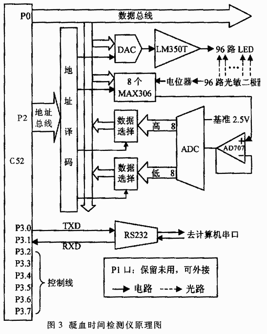 图3与基本结构的原理图。整个仪器以Atmel公司的AT89C52(以下称间C52)单片机为核心实现数据采集和控制,配合电-光-电转换电路的A/D转换器(ADC)等来检测样品的透光率及其变化。A/D转换器采用Analog Devices公司的16位ADC——AD7660,仪器分辨率达到2 16,大致相当于一个4位半万用表的精度;ADC的量程是0~2.5V。