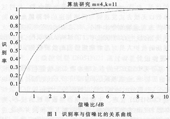 下面考虑对某个已知类型的雷达的一批侦察数据进行处理,计算对该目标的识别率,得到的识别率与信噪比的关系曲线如图1所示。