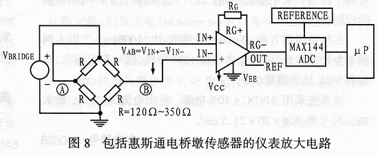 三运放拓扑的真正优势是其能够进行真正的差分测量(很高的CMR),同时又有非常高的输入阻抗,这些特点使其得到了广泛应用,特别是在信号源阻抗非常高的场合。为使信号源对地的漏电流达到最小,本例采用了一些防护技术,信号源电缆采用屏蔽电缆,并将其屏蔽隔离层接到(Vcm+ΔV/2)。图8给出了一个包括惠斯通电桥传感器的放大电路,对该电路的电桥阻抗可适当减小,并不会降低仪表放大器的CMR值。