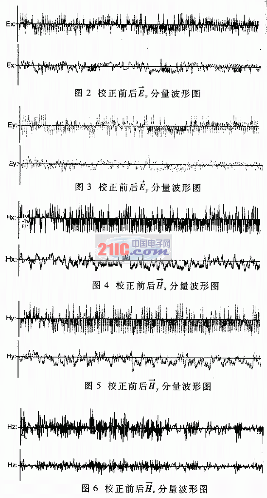 对实际测得的数据进行了多次处理,现先取一些典型的实际结果做一些说明,以给读者一个直观的理解。图2~图6是传感器系统在某一点测得的校正前后的电磁场分量的波形图。