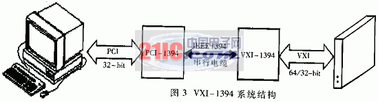 转换扩展就是用一些跟VXI总线无直接联系的通用总线(如GP-IB、1394、MAX-3、光纤通路等),来连接计算机和VXI总线控制器,从而构成GPIB-VXI、VXI-1394、MXI-3、FOXI等控制方案。图3给出了一个典型的VXI-1394系统。由于这些外总线通常都是串行的或者位数很少的并行总线,数据传输过程中需要作大量的总线转换工作,首字节延迟较长,随机读写和字串行性能较低。并且采用这些控制方式的计算机不能直接访问VXI总线的状态、中断、时钟和触发等信号线,系统的实时性和同步性能要受到影响。但是这些系统的组建成本通常都相对较低,GPIB-VXI系统可利用已有的GPIB仪器,VXI-1394和MXI-3系统的块数据传输性能高,MXI-3和FOXI总线的工作距离远,因此它们适合在一些性能要求不是很高、经费不很充裕或者有特殊要求的场合中应用。