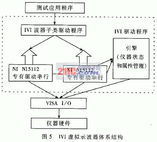 IVI技术试图提供一个仪器驱动程序标准,为可互换的仪器提供了一个健壮的框架,并着力解决困优测试系统开发者的仪器性能问题。IVI规范把仪器分成一个系列的子类,例如DMM、示波器、开关等,并按照某一子类仪器最通用的特征和功能来为该子类仪器制定规范。IVI建立在VISA I/O层以上,把传统的仪器驱动程序分成子类驱动程序和仪器专有驱动程序两个子层。专有驱动程序执行传统的仪器驱动程序功能,但是具有性能优化的低层结构和仪器仿真功能。子类驱动程序包含该类仪器的通用功能函数,这些函数直接调用相应的专有仪器驱动程序函数。图5给出了一个采用IVI技术的虚拟示波器体系结构。