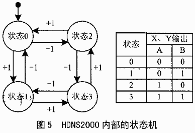 在HDNS2000内部有两个状态机分别指示X、Y两个方向,每个状态机又有四个稳定的状态。图5是状态机的示意图。由图5可见,一开始系统处于状态0,每当检测到物体向正向或反向移动1个单位时就转移到下一个状态,所以只要连续监测状态机状态的变化就可以判断物体移动的方向和距离。图6(a)和(b)分别为负向移动和正向移动时状态机输出的波形。值得注意的是,每个状态的最少停留时间为133μs。