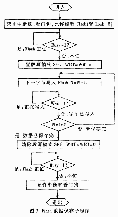 MSP430F437可通过JTAG接口或片内BOOT ROM下载调试修改程序,甚至允许用户程序在运行中将采集处理的数据快速安全地保存到Flash存储器中,而无须任何外接器件。数据保存要用快速的段写入方法和写字节序列模式,写入电流小(3mA),写入速度快(≤25ms/512字节,远超过串行EEPROM的页写速度5ms/16字节),10万写入次数,100年数据保存。每次采集处理完毕,即将16字节/批数据“批号-时间-环境参数”存入段32~63。图3为16字节数据存入的程序框图,其中Lock、Busy、SEG WRT、WRT、Wait是Flash控制寄存器内涉及编程的各控制位或状态位。